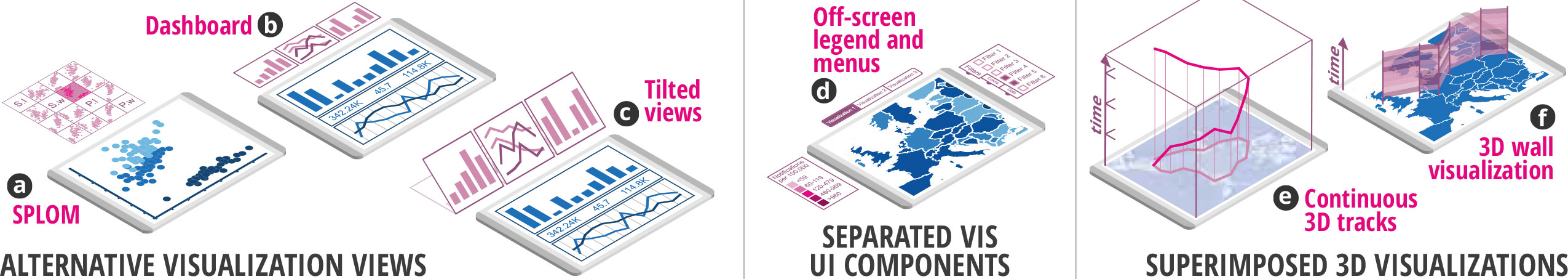 Using AR for Alternative Visualization Views, Separated Visualization User Interface Components, and Superimposed 3D Visualizations. (a) SPLOM shows alternative scatterplots configurations; (b) Distributed views of a dashboard; (c) Tilted AR views; (d) Off-loaded legend and menus; (e) Continuous 3D track above a map; (f) 3D wall visualization aligned to a map;