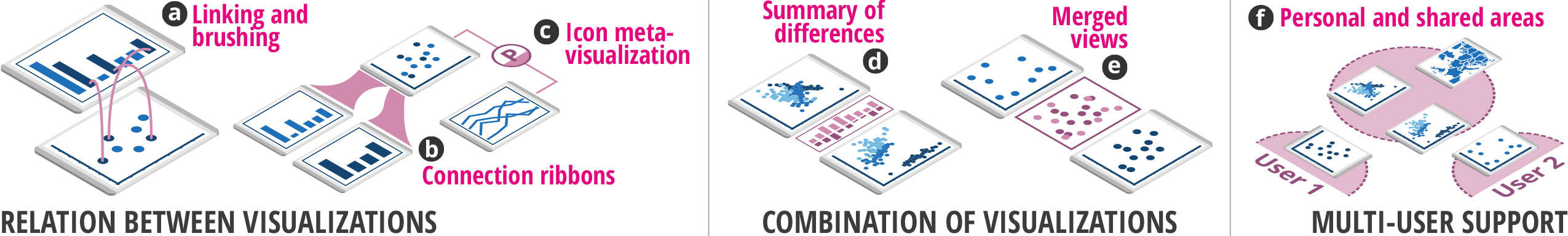 Visualizations, and Multi-User Support. (a) Linking and brushing supported by curved AR connections; (b) Ribbons between devices indicate the relative proportions; (c) Icon meta-visualizations reveal view relations; (d) AR bar chart summarizes calculated differences between views; (e) Merging two views in AR; (f) Personal and shared areas for collaborative activities;
