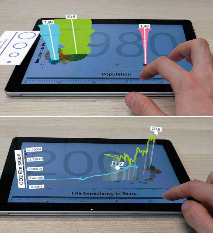Scatterplot extended with 3D glyphs and another scatterplot superimposed with 3D trajectories. These examples illustrate how existing interfaces (in this case inspired by the Gapminder bubble plots) can be extended.