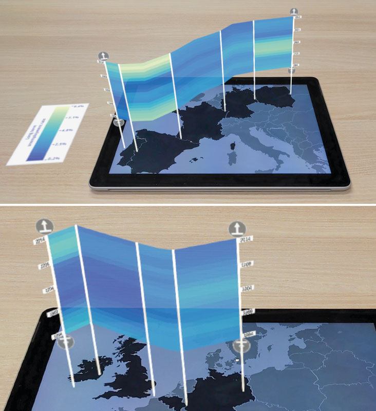 Adaptation of the technique Great Wall of Space-Time (by Tominski & Schulz, 2012). The wall in AR details unemployment data per selected country over time (from the bottom to top).