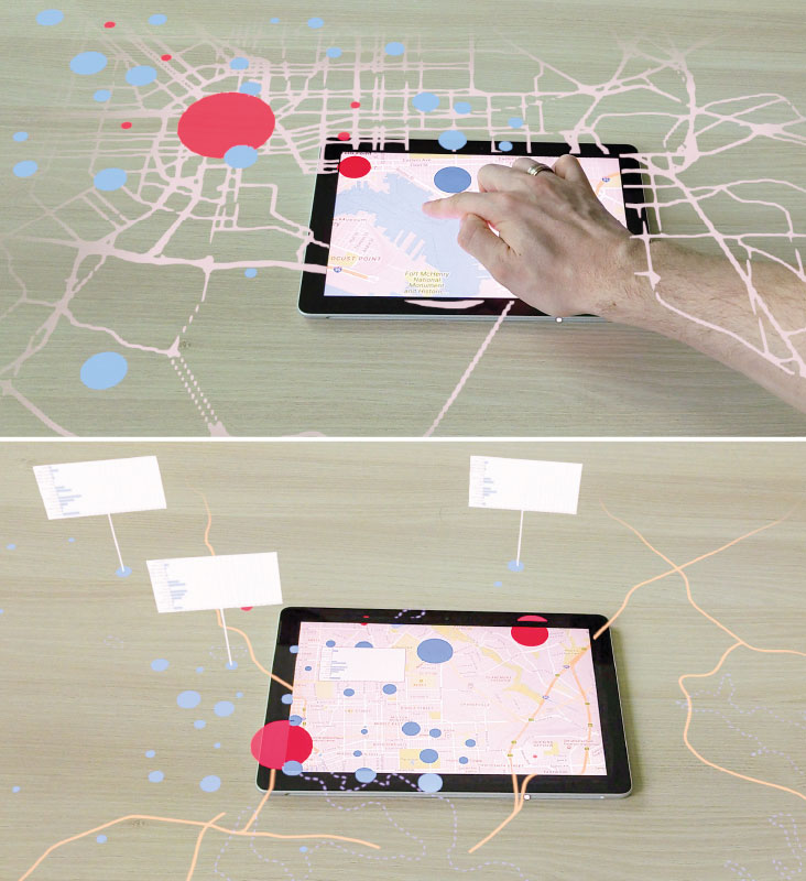AR is used to continue the map using less details (street-layer and data items) or a more abstract visual style (highways, bodies of water, and data items). Also illustrates details-on-demand on both the mobile device and in AR.