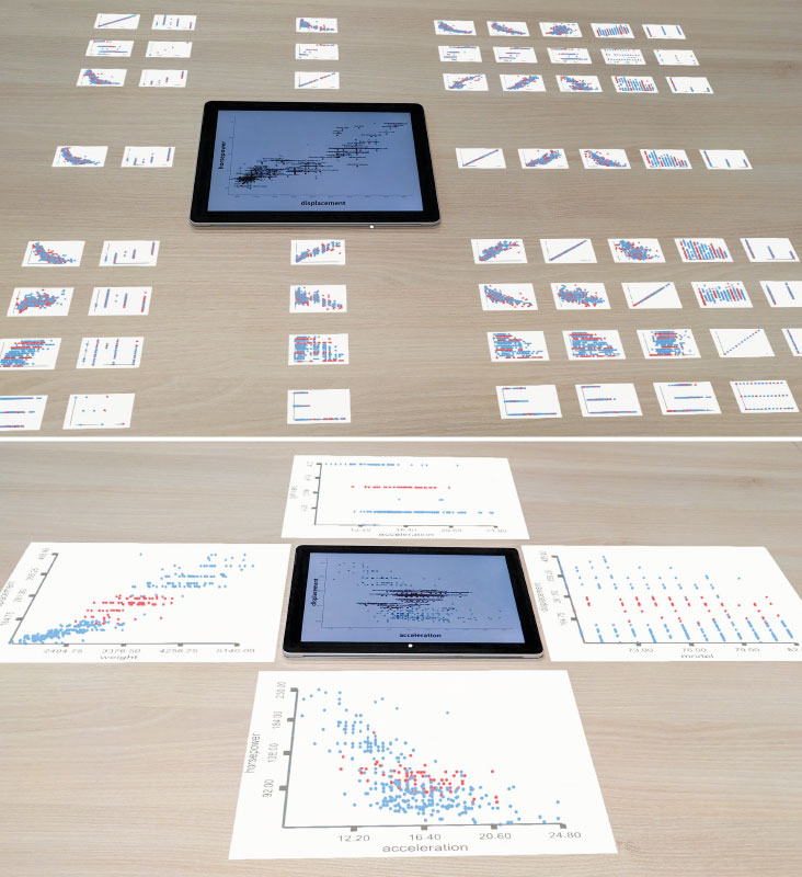 AR is used to show a SPLOM around the mobile device. The tablet shows a detailed view of one specific cell corresponding to its position in the matrix. Alternatively, only the four neighboring cells are visible in AR, but in a tablet-sized scale.